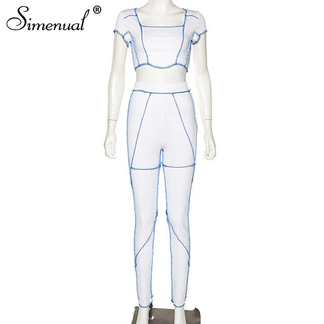 Simenual Striped Patchwork Sporty Matching Set Women Fashion Casual Workout 2 Piece Outfits Short Sleeve Crop Top And Pants Sets